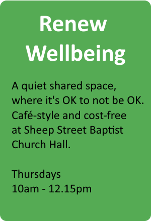 Renew Wellbeing is a Cafe-style Wellbeing space which is open nearly every Thursday between 10.00am and 12.15pm (Please check the Calendar during Christmas and Summer holidays)